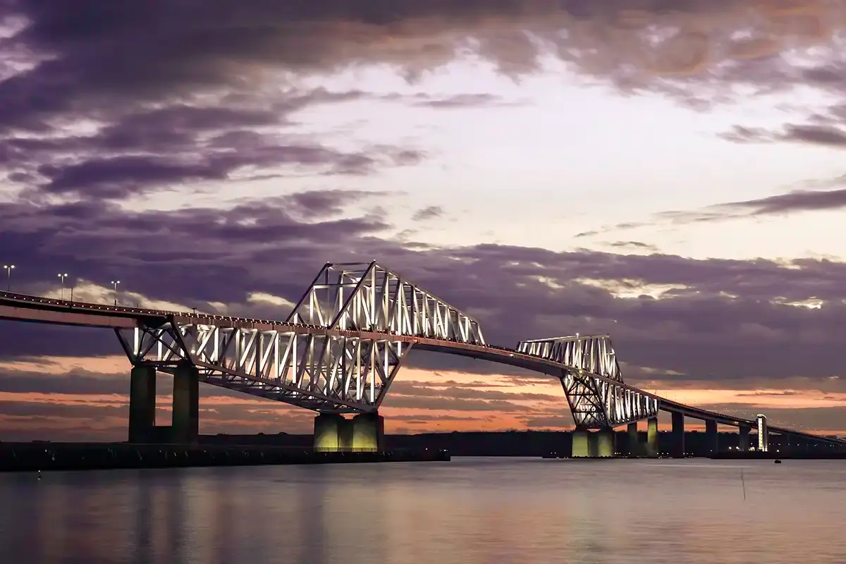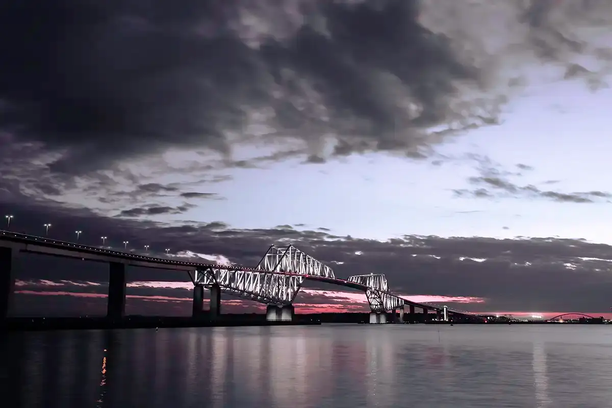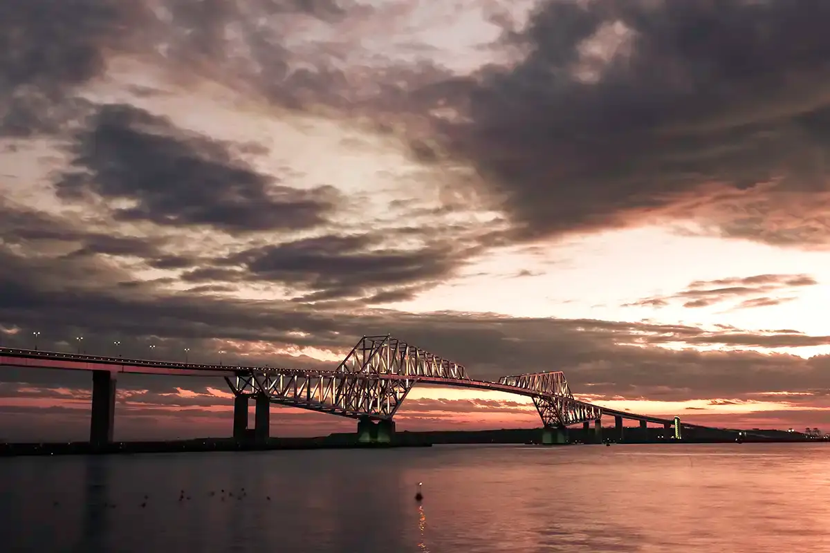 To the north of the bridge, there is a concrete wall approximately 300 meters long. It features a barrier and is a frequent spot for local anglers. This surface is flat and stable, allowing a tripod to be set up securely. From this angle, the composition includes the span of the bridge and the distance across Tokyo Bay toward Haneda Airport.