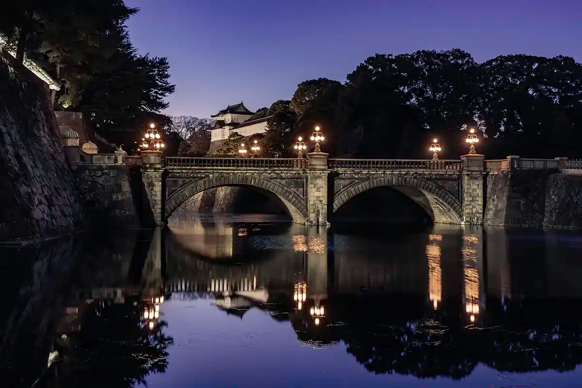 Two Imperial guards are always on duty here. While you generally cannot cross the bridges on a normal day, they form the “classic shot” of Tokyo: the stone bridge in front, the iron bridge behind, and the white castle watchtower towering above. For a truly special photo, visit on a winter night when the illuminations are active.